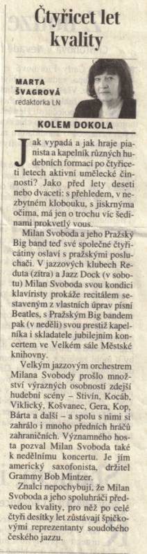 Jediný koncert mimo Redutu uspořádali v příjemnějším prostředí sálu rovněž s jazzovými tradicemi – v sále Městské knihovny a hlavně do něj pozvali jednu místní legendu: Pražský Big Band, který slaví čtyřicet let existence. I když v posledních letech tato kdysi Milanem Svobodou založená kapela vystupuje zřídka, jubilejní koncert se přece jen uskutečnil v neděli 18. 10. v celkem slušně zaplněném sále. Z původního složení legendární kapely založené hlavně Svobodovými spolužáky z Pražské konzervatoře snad v současnosti už hraje pouze trumpetista Michal Gera, který nechyběl ani tentokrát. Jinak již hraje druhá či třetí generace hráčů, ale soudě podle koncertu i posledních nahrávek stále udržuje původního ducha kapely spočívajícího v kombinaci americké tradice kapel typu Dona Ellise či Gila Evanse s vlastními kompozicemi šéfa kapely. V poslední etapě od roku 2005 hraje kapela v klasickém obsazení a vydává i desky, zve si i hosty. Tak tomu bylo i v Městské knihovně – první část tvořily Svobodovy klasické kompozice (Ejhle, člověk a úpravy Jaroslava Ježka), po přestávce došlo na amerického hosta, saxofonistu a band leadera, Boba Mintzera ve třech jeho skladbách a v jedné Svobodově. Tak po krátké době od Linkova letošního Bohemia Jazz Festu jsme viděli u nás Mintzera opět, ale bez jeho spoluhráčů z Yellow Jackets. Ve své skladbě Událost příštího dne si Svoboda dokonce zahrál i na piano, takže spokojenost byla veliká. Škoda, že pro úraz nemohl dorazit další z pamětníků a prvních spoluhráčů, Michal Kocáb. A nová jména jako Milan Krajíc (saxofon), Jan Andr (piano) či Tomáš Křemenák (saxofon) si určitě budeme pamatovat do dalších koncertů.